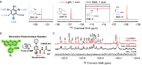 (A)自由基在不同位置处19F的自旋密度及极化性能;(B)19F NMR识别及信号增强机制;(C)1 μM氨基酸混合物的19F NMR谱。evo视讯官网供图